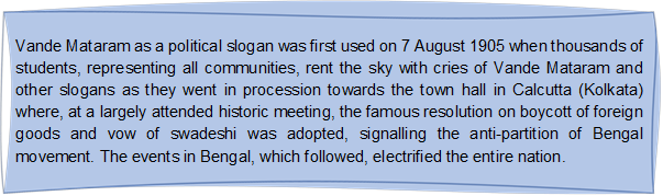 During the stormy days of 1905, the anti-partition and Swadeshi movement in Bengal, the appeal of the song as well as of the slogan Vande Mataram, became very powerful.