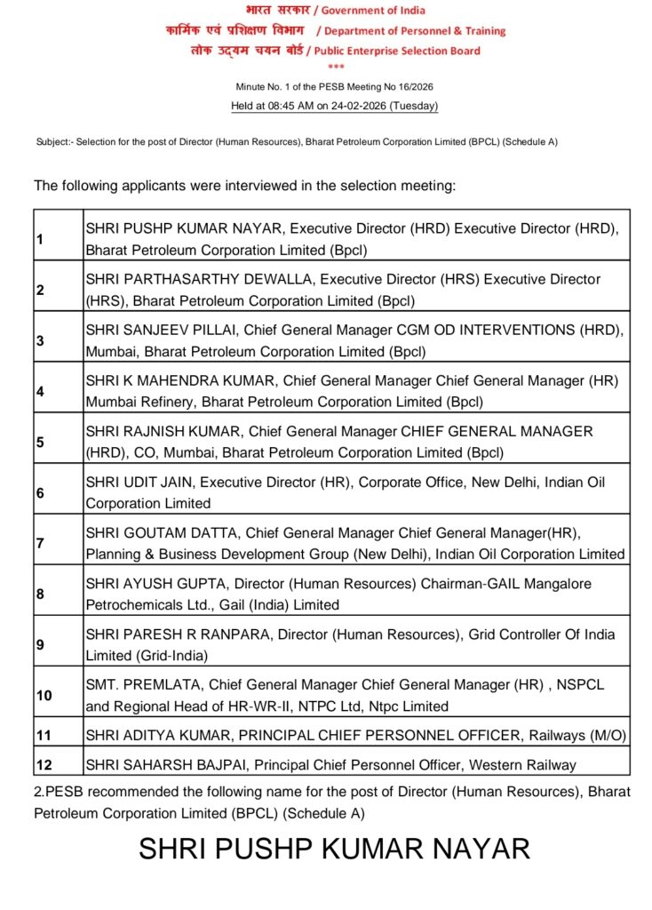 The recommendation marks an important leadership transition in BPCL’s HR function at a time when the company is focusing on talent development, operational efficiency, and future-ready workforce strategies.