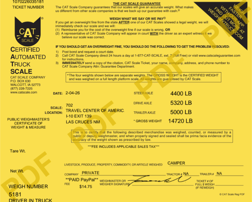 Once we were confident in hitch setup, we took the truck and the trailer to the CAT scales that truckers rely on to stay out of legal trouble on the highway. Our nearest scale is only a short distance away at a TA truck stop.