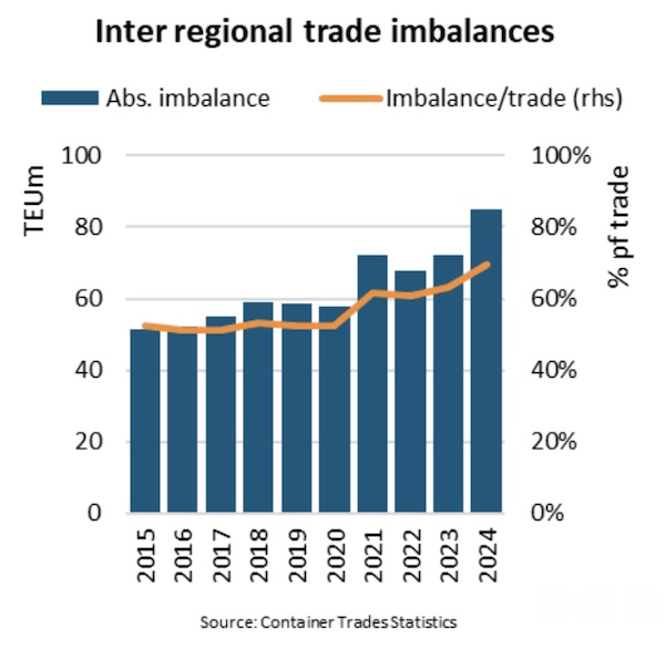 In 2019, regional imbalances totalled 58.8m TEU, equal to 52% of inter-regional trade, but grew to 84.9m TEU and 70% in 2024.