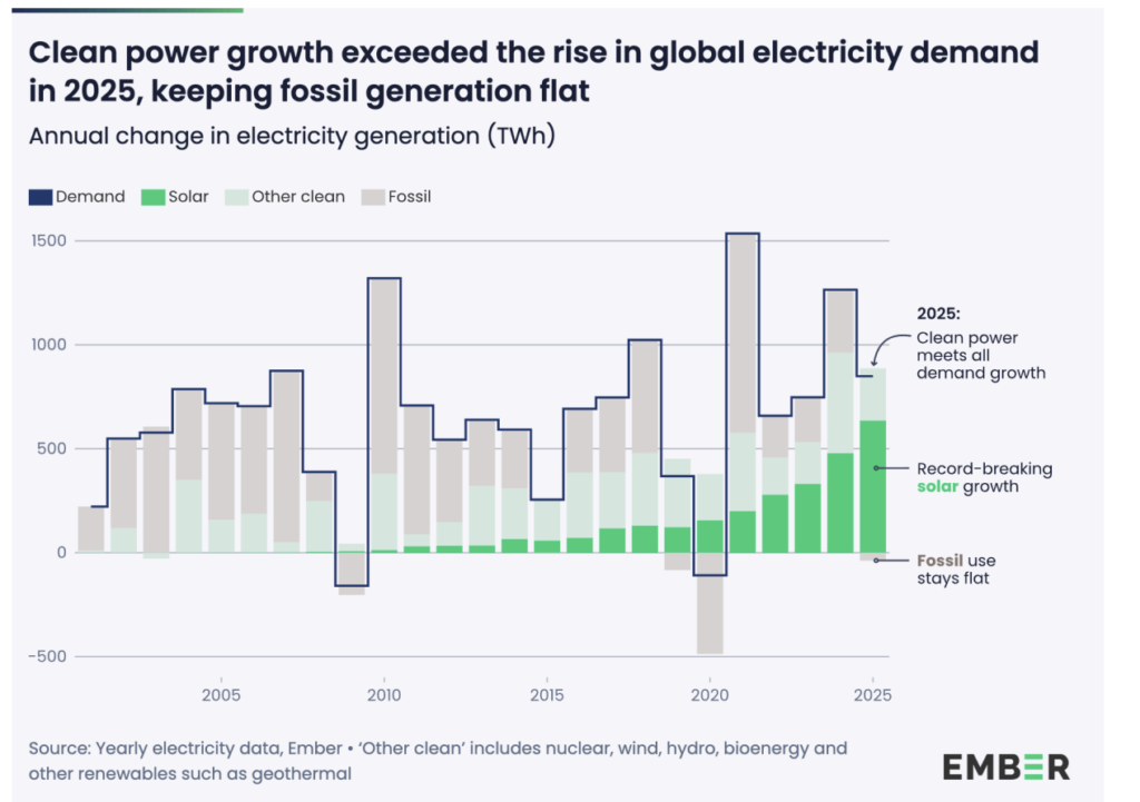 The global energy transition reached a decisive milestone in 2025, as the rapid expansion of renewable energy successfully met the entire growth in electricity demand, preventing any rise in fossil fuel-based power generation, according to a new report by Ember.