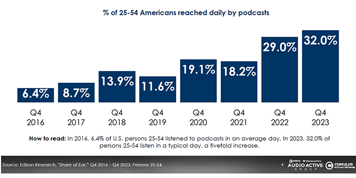 The Audioscape report examines the latest podcast consumer trends as well as the remarkable growth of the medium in recent years. It points to Edison’s Share of Ear data showing a third (32%) of Americans aged 25-54 listened to podcasts on a daily basis during the fourth quarter of 2023. That was up from 29% at the end of 2022. And in 2016, 6.4% of Americans 25-54 listened to podcasts in an average day.