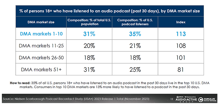 “There is a kind of a top market skew to the podcast monthly audience,” Bouvard says. Nielsen Scarborough data shows that people in the top 10 U.S. cities are 13% more likely to be podcast monthly listeners, while people living in markets outside the top 50 are 19% less likely to be podcast listeners. “There is an opportunity outside of the top 50 to kind of develop podcast as a media platform and grow audience,” Bouvard says.
