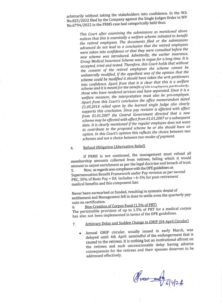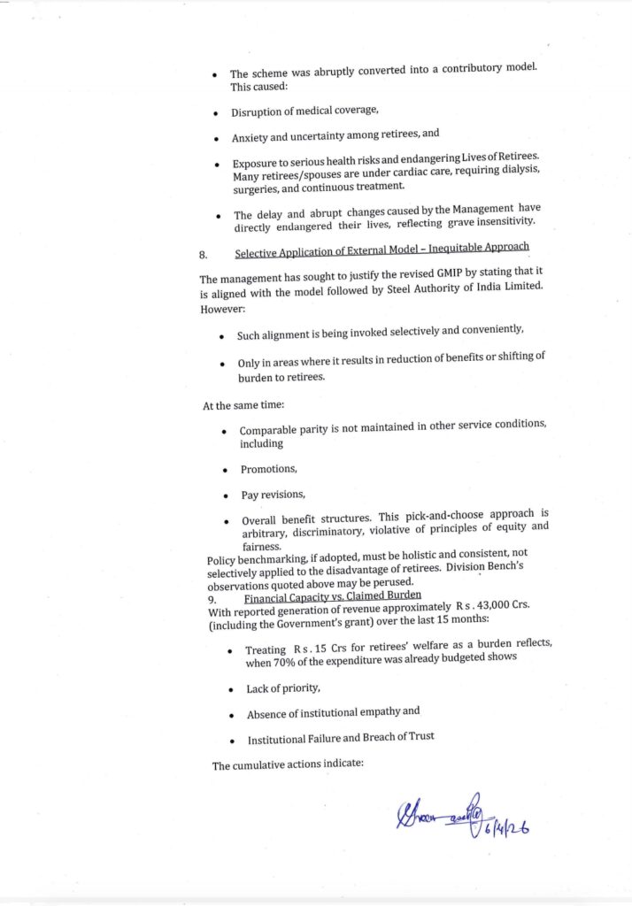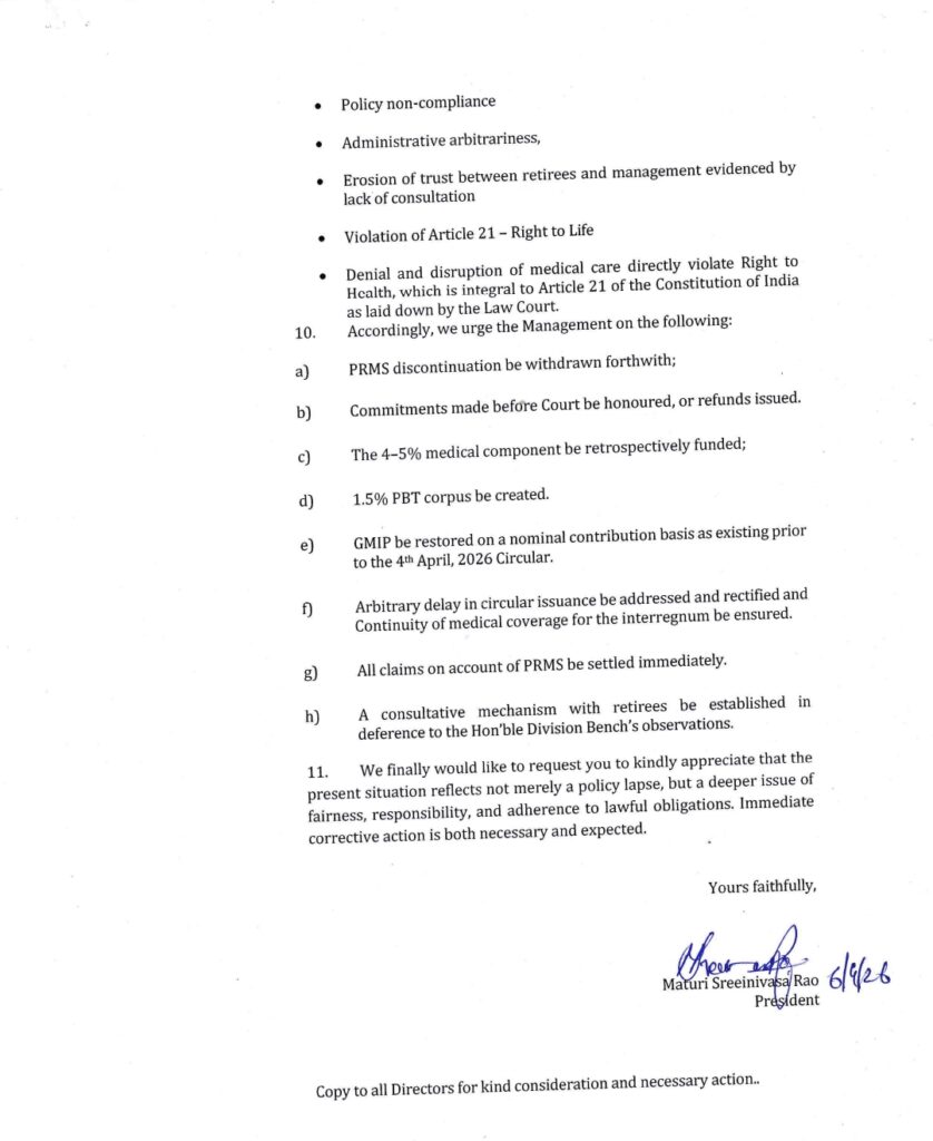 Retired executives of Rashtriya Ispat Nigam Limited (RINL) have raised serious concerns over the discontinuation of the Post Retirement Medical Scheme (PRMS), delays and abrupt changes in the Group Medical Insurance Policy (GMIP), and non-compliance with DPE guidelines on post-retirement benefits. In a detailed representation, they allege administrative arbitrariness, financial mismanagement, and violation of legal and constitutional obligations, including the right to health under Article 21. The retirees have demanded immediate restoration of PRMS, creation of mandated medical corpus funds, refund of contributions if the scheme is withdrawn, and a consultative mechanism to ensure fair and transparent policy decisions.