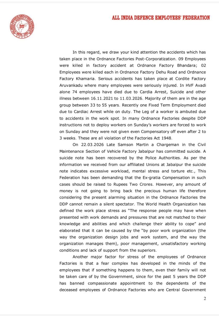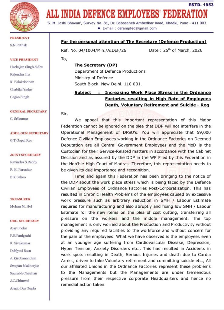 The All India Defence Employees Federation (AIDEF) has raised serious concerns over increasing cases of deaths, suicides and voluntary retirements in 7 Defence PSUs , attributing them to excessive work pressure, unsafe working conditions and mental stress following corporatisation. In a representation to the Department of Defence Production, AIDEF highlighted multiple incidents, including fatal accidents in factories like Bhandara, Khamaria and Dehuroad, and a worrying trend of cardiac deaths and suicides among employees—particularly in the 33–55 age group. The federation also pointed to harsh production targets, reduced labour estimates and extended working hours, including Sundays, as key contributors to the crisis.