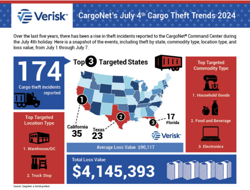 The upcoming July 4th holiday week will have an increased risk of cargo theft, as extended business closures can create an advantageous operating environment for cargo thieves, according to the logistics security firm CargoNet.
