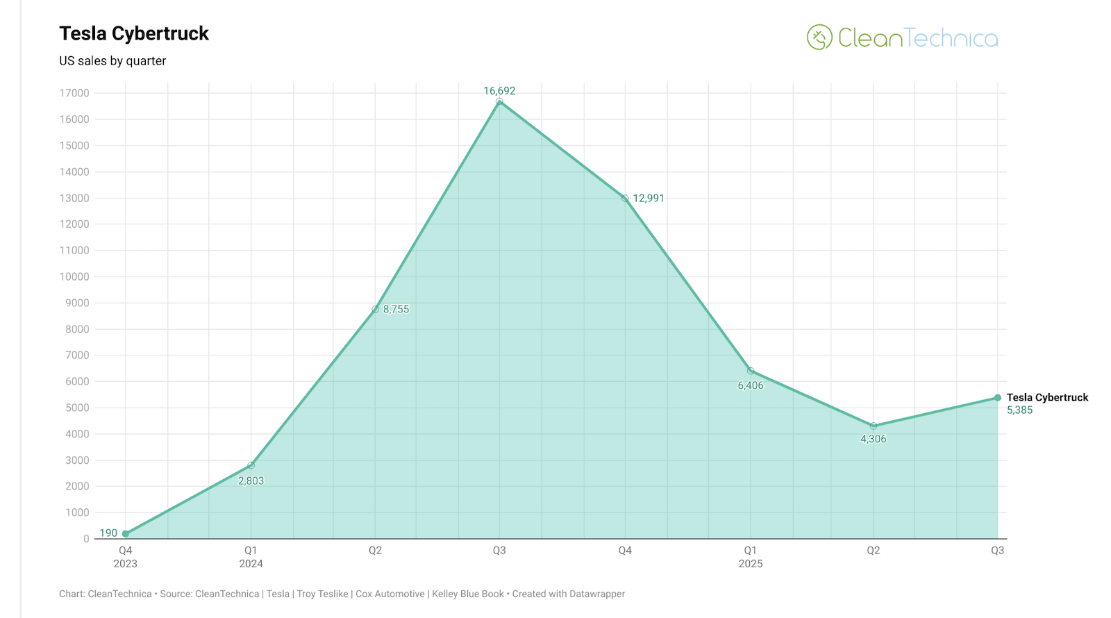 The Rivian R1T electric pickup truck is far down from its peak. Despite a bump in the third quarter, the model’s performance in 2025 does not look good. With so much competition on the large, quite expensive, premium-class EV market, it’s just hard to make a lot of sales. There’s a lot more choice than in 2022 and 2023, and not the pent-up demand or backlog of orders Rivian had back then. The R2/R3 can’t come soon enough….