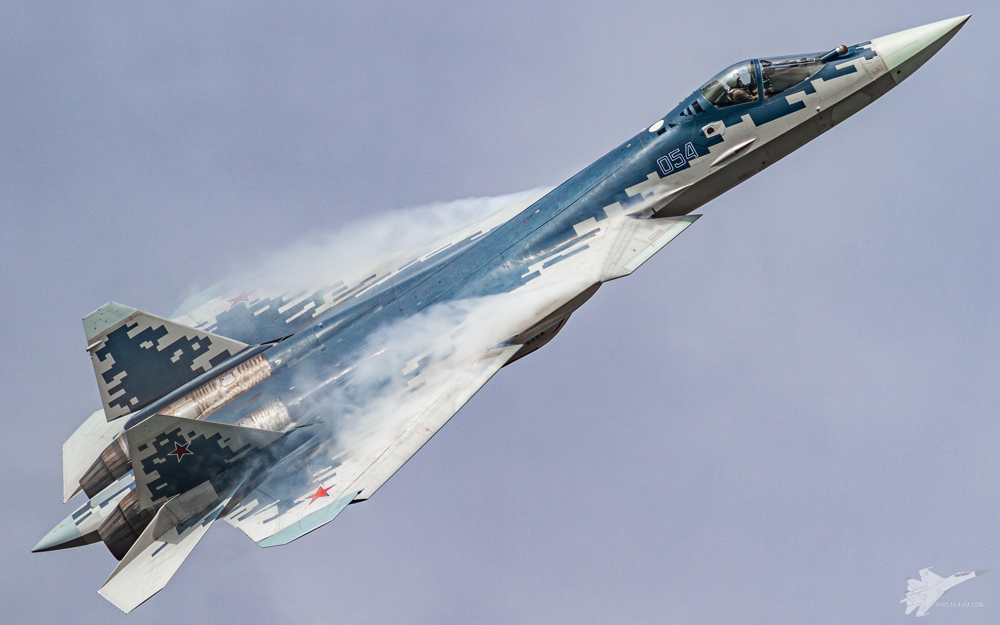 T-50-9, also known by its bort number ‘059 Blue’, was specifically repainted by UAC to resemble a more operational scheme specifically for its appearance at Dubai. The airframe also features the full mission suite integrated on serial Su-57s, including the 101KS ‘Atoll’ electro-optical system, and has the capability to fire live missiles, making it one of the most production-representative prototype airframes.