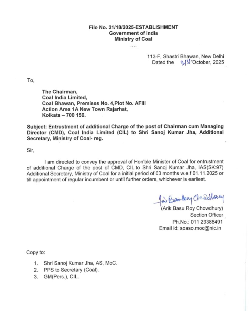 Sanoj Kumar Jha, an IAS officer of the 1997 batch, currently serving as Additional Secretary, Ministry of Coal, has been given the additional charge of Chairman and Managing Director (CMD), Coal India Limited, for a period of three months with effect from November 1, 2025, or until the appointment of a regular incumbent, whichever is earlier.