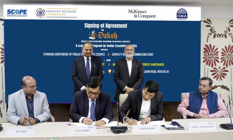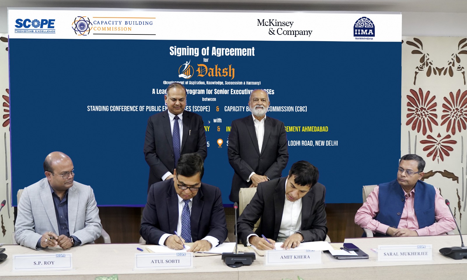 Marking the launch of DAKSH (Development of Aspiration, Knowledge, Succession & Harmony), a pioneering Leadership Development Program, Standing Conference of Public Enterprises (SCOPE) and Capacity Building Commission (CBC), GoI signed an agreement with McKinsey & Co. and IIM- Ahmedabad as Knowledge and Academic partner respectively for developing dynamic leaders in the Public Sector.