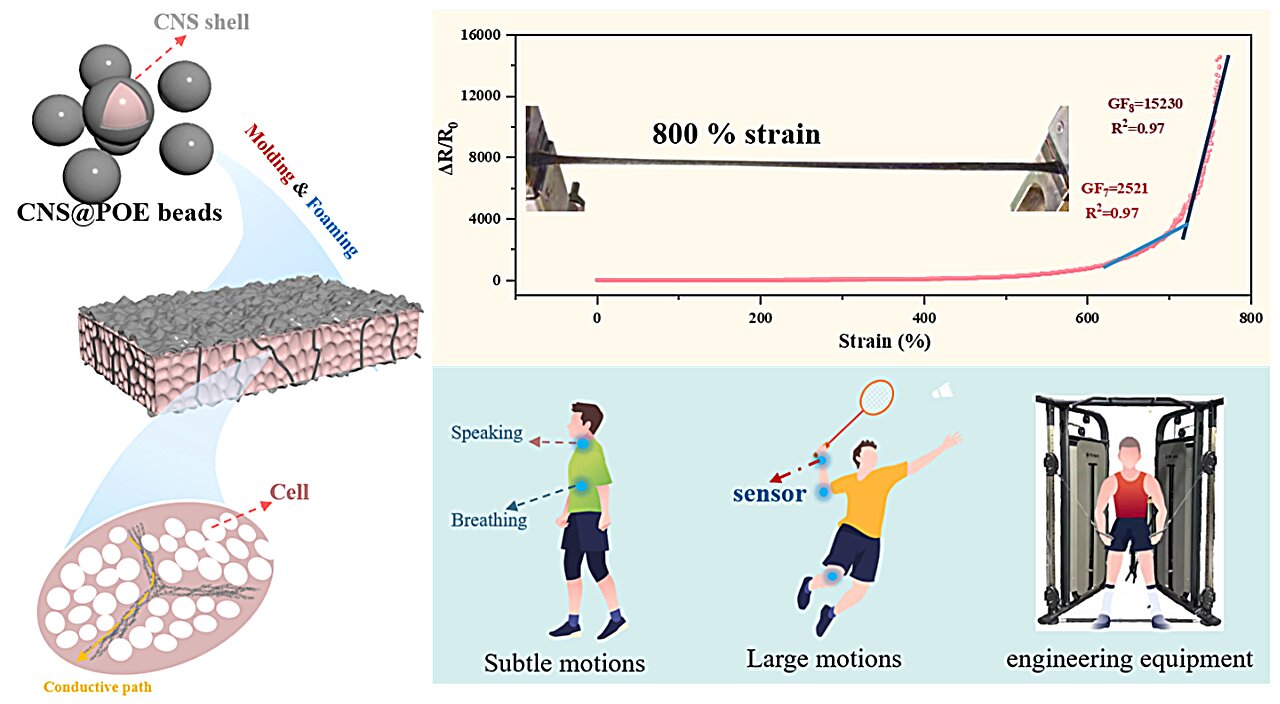 The developed POE/CNS foam exhibits remarkable stretchability (952.5% strain), elasticity (with a residual strain of 13.8%), and (with a resistance of 50 kΩ). The segregated structure gives the POE/CNS foam sensor an exceptional strain response range from 0.5% to 762%, significantly outperforming randomly distributed structures.