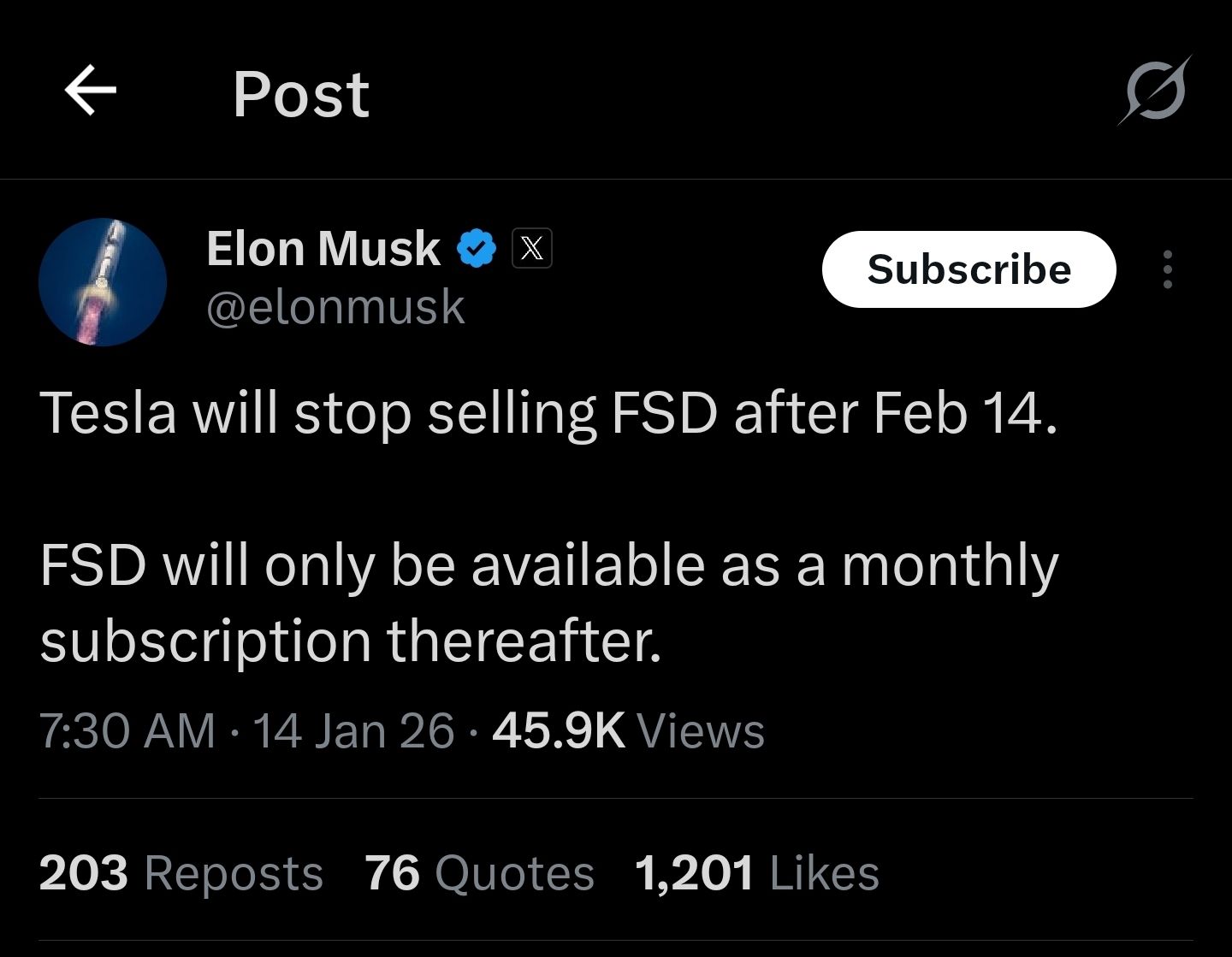 Well, whatever the reason, you supposedly will not be able to buy FSD after February 14, 2026.