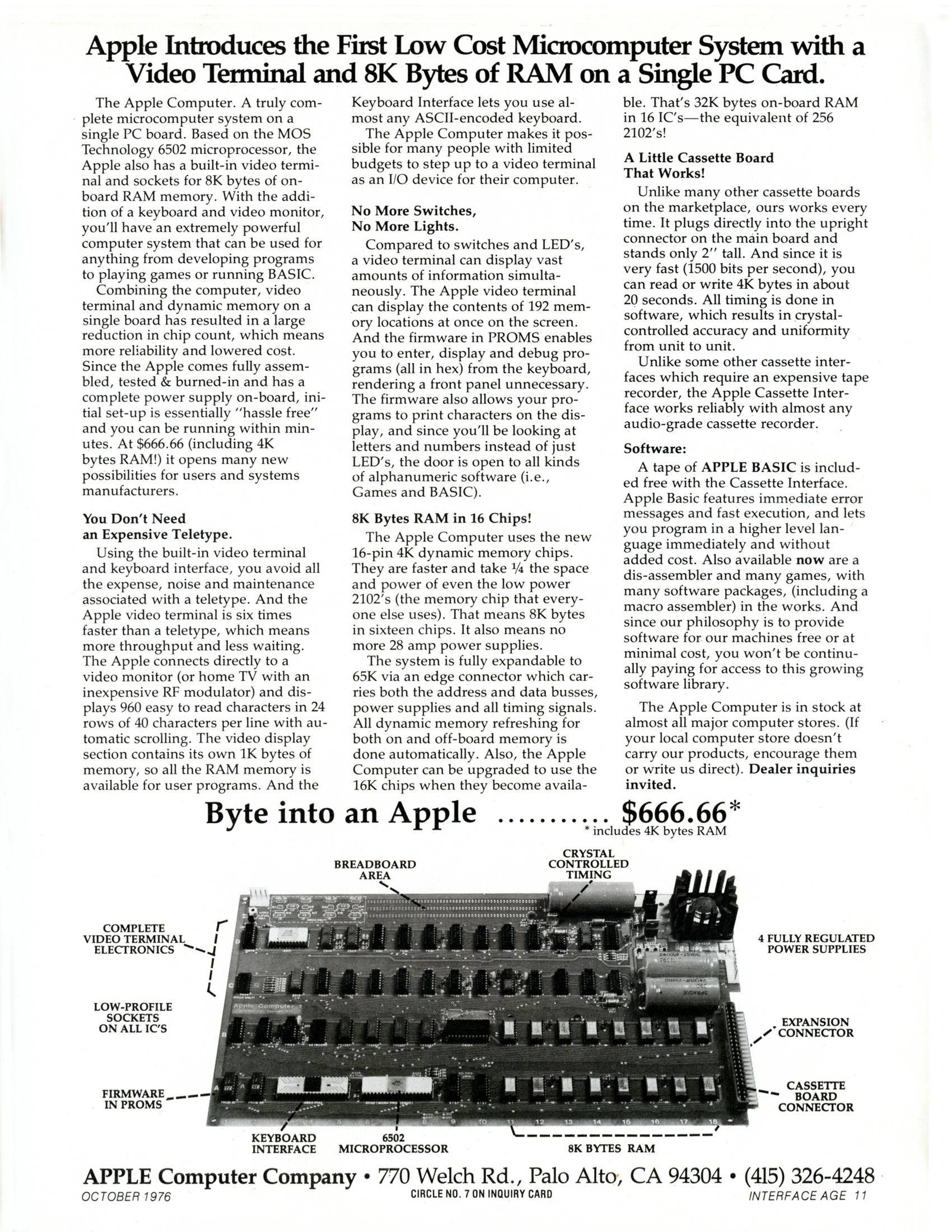 When I bought the Mac­Book on which I’m writ­ing this post, I sim­ply opened it up and, nat­u­ral­ly, found it ready to use. That would scarce­ly have been imag­in­able to com­put­er enthu­si­asts of the mid-sev­en­ties, accus­tomed as they were to sol­der­ing indi­vid­u­al­ly pur­chased chips onto elec­tron­ics boards by hand. The Apple I marked a great leap for­ward in con­ve­nience by com­ing already assem­bled, albeit with­out a mon­i­tor, a key­board, or even a case; the pur­chase price of USD $666.66 (clos­er to $4,000 today) just got you the board. But what a board.