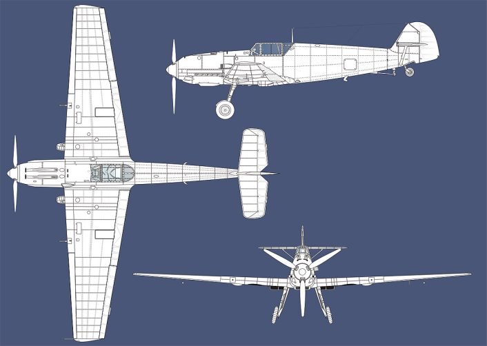 Vogt and his team went to work, adopting a laminar flow airfoil section and abandoning Messerschmitt’s idea of using standard Bf 109G wings for the outer sections. The center section of the wing was also redesigned, and after wind tunnel tests revealed that two large radiator intakes over the trailing edges of the center section were far more efficient than the original four mounted beneath the center section of the wing, and since they would not be obstructed by retracting landing gear, they were incorporated into the new design. Undercarriage legs and wheels from a Junkers Ju 87D-6 replaced the Bf 109G units, along with the aft fuselage being reinforced. The vertical tail section was enlarged and the horizontal tail surfaces of the Bf 109 replaced.
