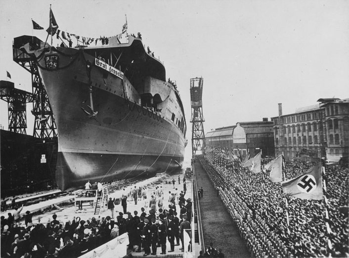 An agreement on June 18, 1935, with the British allowed Germany the construction of two aircraft carriers. Construction of Germany’s first aircraft carrier began on the Dec. 28, 1936, at Deutsche Werke shipyard in Kiel. On Dec. 8, 1938, the carrier was launched, christened the Graf Zeppelin in honor of the famous airship designer.