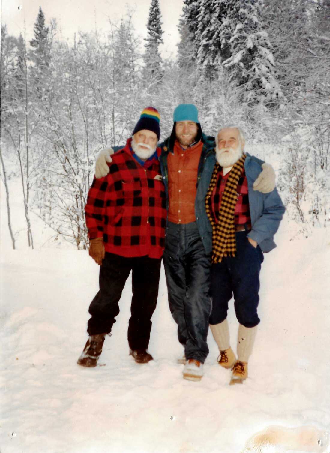 Composer Lou Harrison (left) and musician William Colvig (right) visit Adams in Alaska in 1987.
