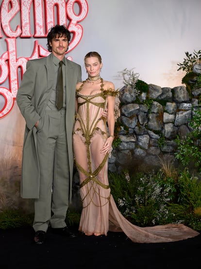 On the red carpets, and during photocalls and interviews, the Elordi-Robbie duo have worked hard to make us believe in an intense chemistry between them, as if the film itself wasn’t enough to convince. Moreover, the news has spread that Robbie ordered two signet rings inscribed with Emily Brontë’s words from her novel — “Whatever our souls are made of, his and mine are the same” — one for her and one for her co-star. Elordi, for his part, would surprise Robbie by sending her enough roses to “fill her room” on Valentine’s Day, according to an interview for the Australian edition of Vogue. Of course, Robbie has experience in taking a character beyond the set; a year and a half ago she promoted Barbie sheathed in an inexhaustible repertoire of pink gowns.