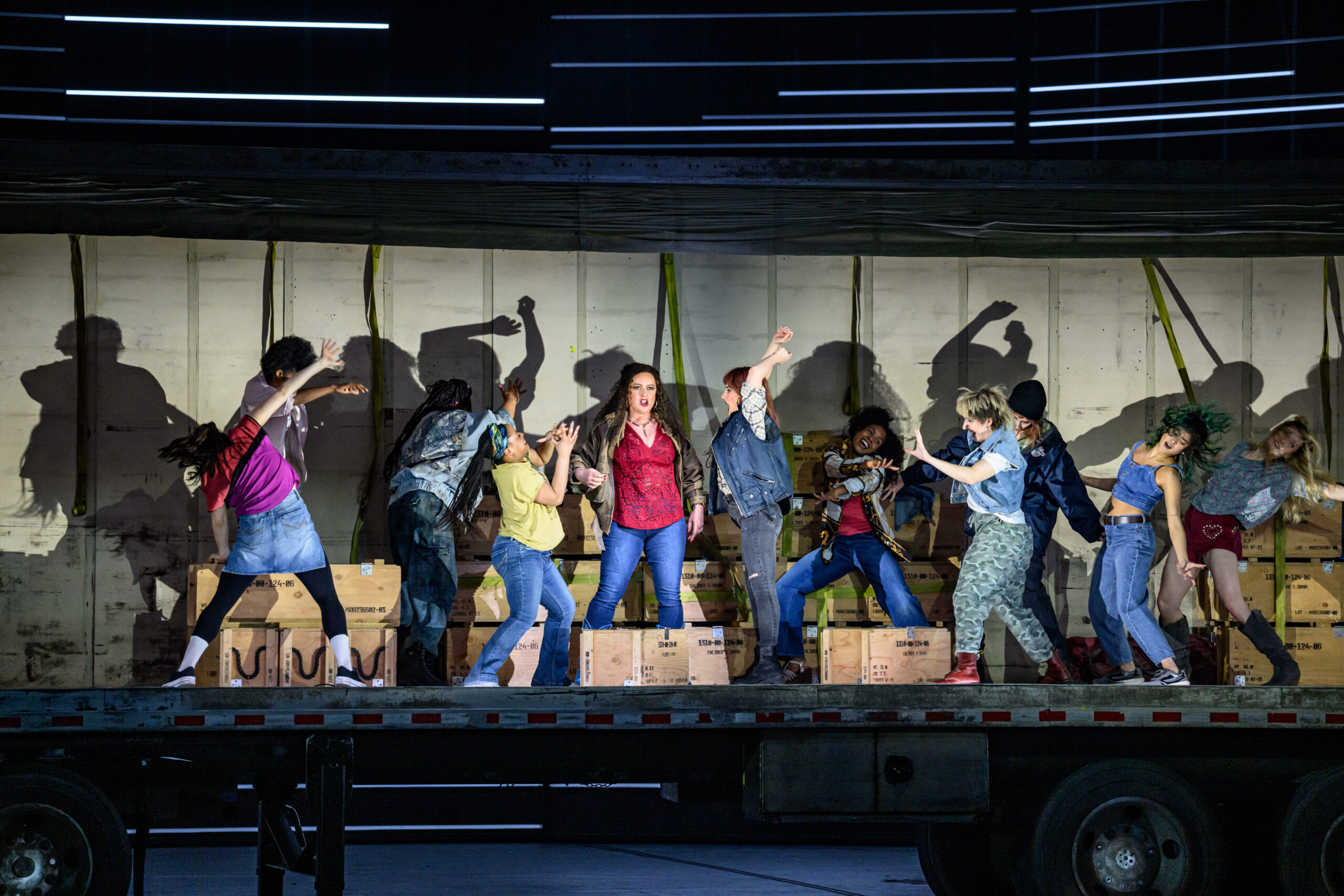 Carrie Cracknell’s Met Carmen inflicts black skies, barbed wire, and machine guns. The act one workplace is a guarded facility all of whose female employees wear pink uniforms. The soldiers outside are joined by vagrants (who however sing as if soldiers). The act two gypsy song is danced (sort of) within the confines of the cargo hold of a moving tractor trailer truck. Later in the same act, Carmen’s solo dance of seduction is positioned atop a gasoline pump, a perch so precarious she needs a helping hand from Jose (whom she is defying). The act three set (Bizet’s “wild spot in the mountains”) is the trailer truck overturned, rotating circularly on its side. Dirt and grime are omnipresent.