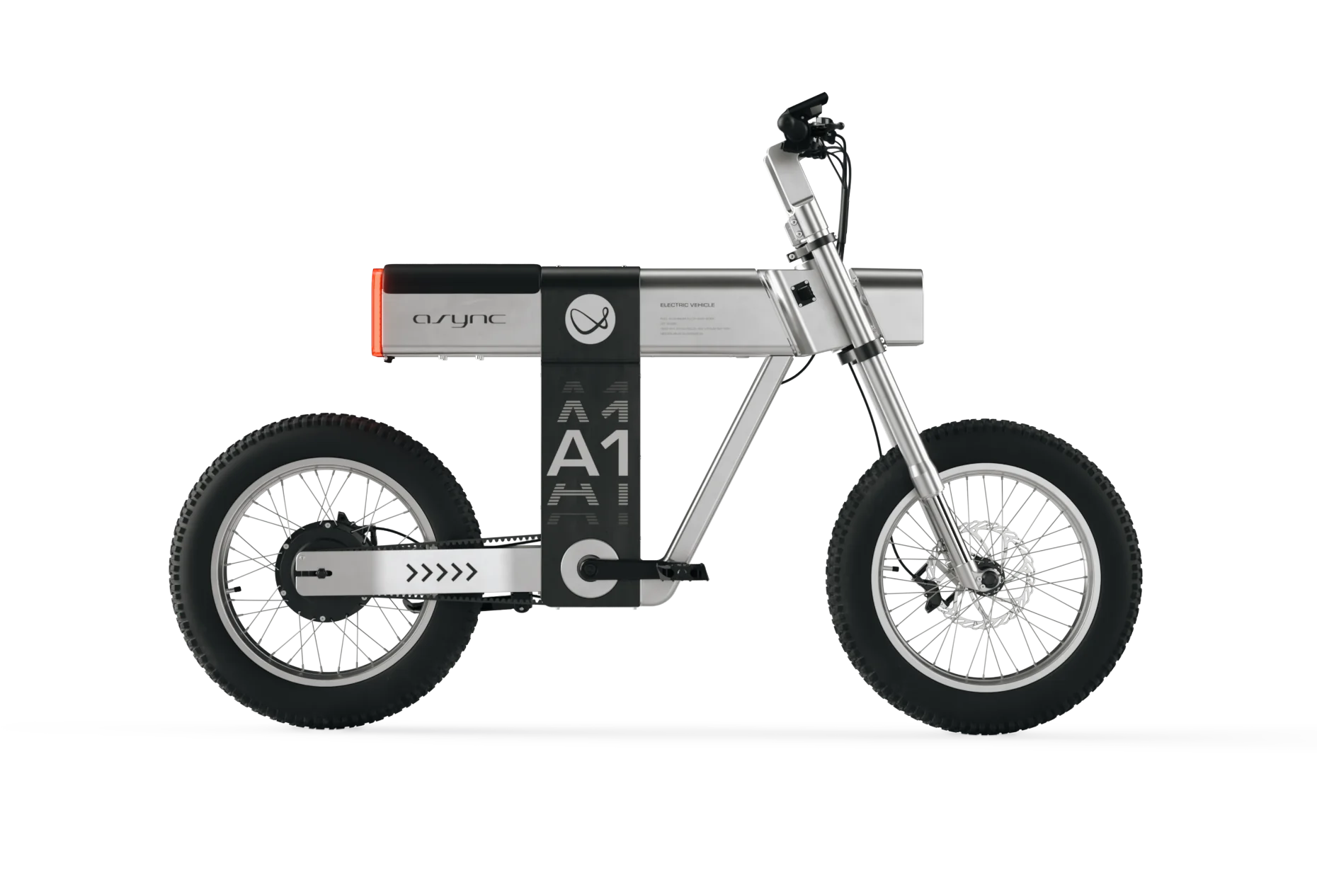 The ASYNC A1, which comes in the basic version with a chain drive or the Pro version with a belt drive, features a 1200W (2500W peak) hub motor capable of delivering 100 Nm of torque to the rear wheel. The A1 frame includes an inverted fork with an air shock in the front and a coilover monoshock in the rear (which is hidden in the frame just above the bottom bracket), with dual 4-piston hydraulic disc brakes for stopping power, and the bike rolls on 20″ x 4.0″ knobby tires for both street and all-terrain riding. Most of the bike’s components are rated IPX7 and so are essentially waterproof.