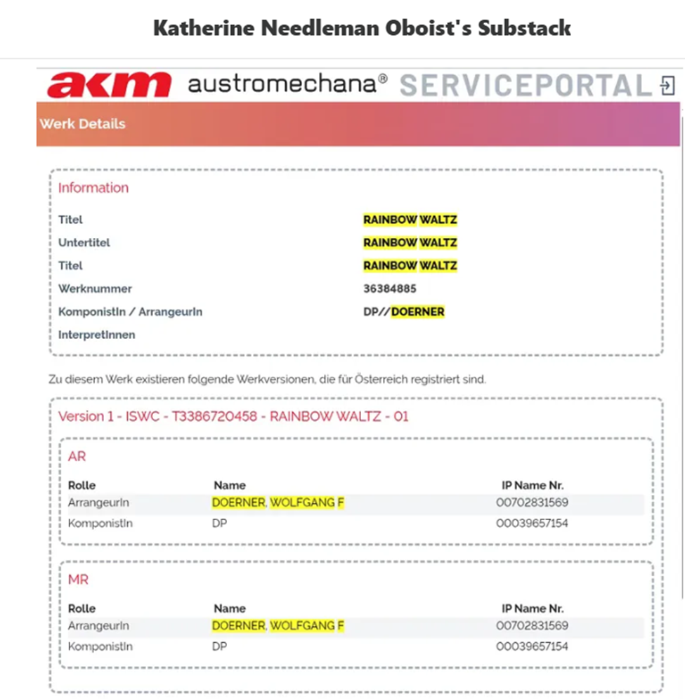 SO TO THE POINT: Oboist and ever-intrepid virtuosa blogger Katherine Needleman has kept after this, yesterday posting to her Substack (and Facebook) a new, beautifully documented post that reveals the legal sleight of hand that Nézet-Séguin and the VPO have employed in order to avoid admitting what they did: in Austria’s music right’s society (AKM: Autoren, Komponisten und Musikverleger) – the counterpart to BMI or ASCAP, roughly. To put it briefly, they backed off of the attribution to Price, simply stating that the Rainbow Waltz was “Public Domain” (DP = “Domaine publique”).
