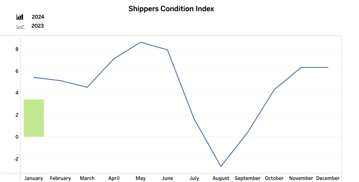 FTR’s January Shippers Conditions Index (SCI) fell 3 points in January to a reading of 3.4. While still positive, the SCI was the weakest it had been since September, Bloomington, Indiana-based FTR said.