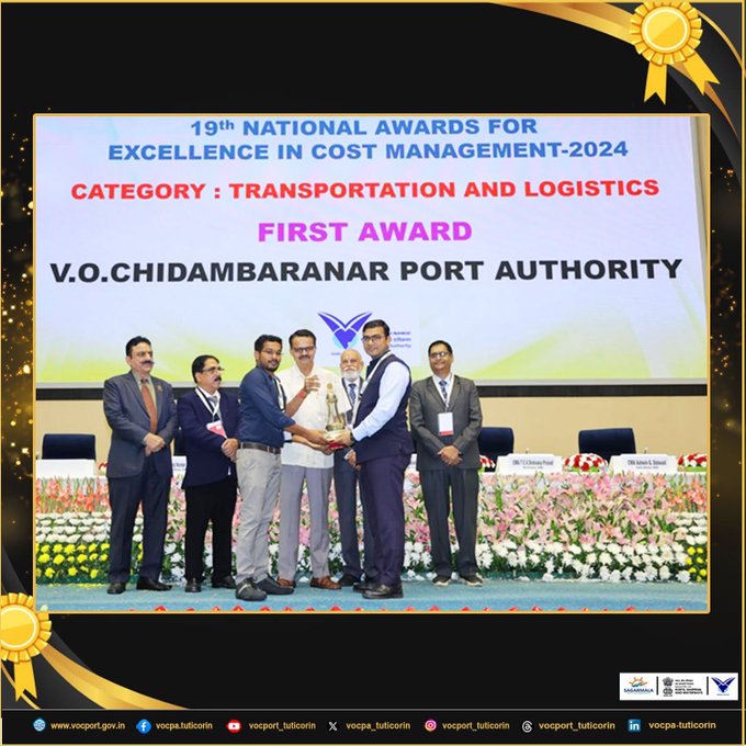 NEW DELHI : VOC Port Authority has been awarded First Place for Excellence in Cost Management for the year 2024 by the Institute of Cost Accountants of India, under the category ‘Transportation and Logistics’.