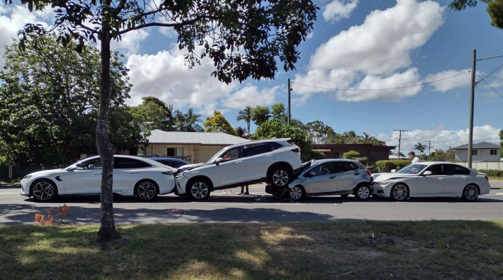 It appears from the photos Ron supplied that as he was slowing down, a Great Wall Haval slowed down to match his speed, but the other two cars, a Mazda and a BMW, clearly did not. The BMW ran up the rear of the Mazda as it rammed into the back of the Haval. Ron’s BYD Seal was the only car not written off.
