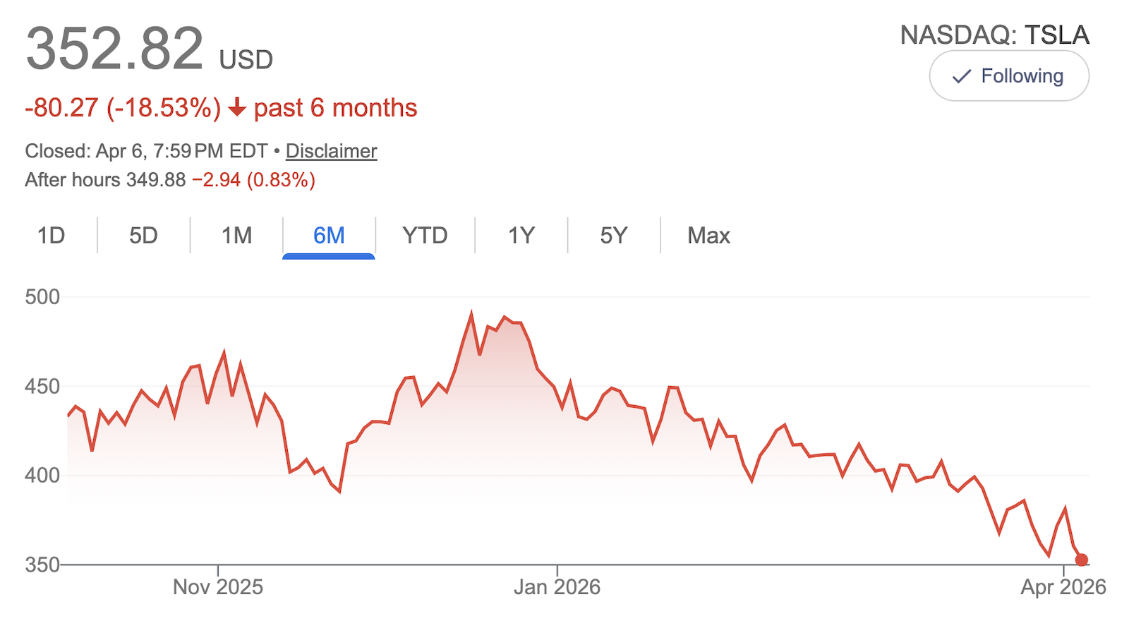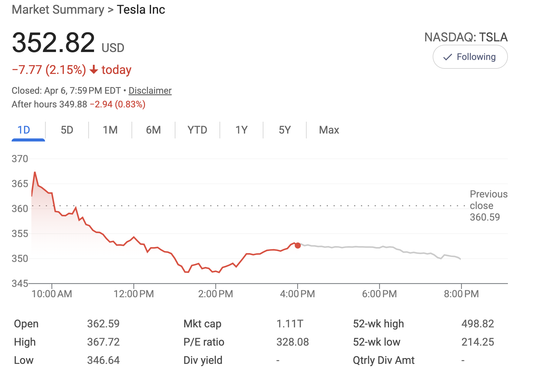 Tesla’s stock price continues to slide. It was down 2.15% today after a clear slide and then a leveling off at the lower level. It was definitely a “down and out” day rather than the roller-coaster ride you often see with stocks like TSLA.
