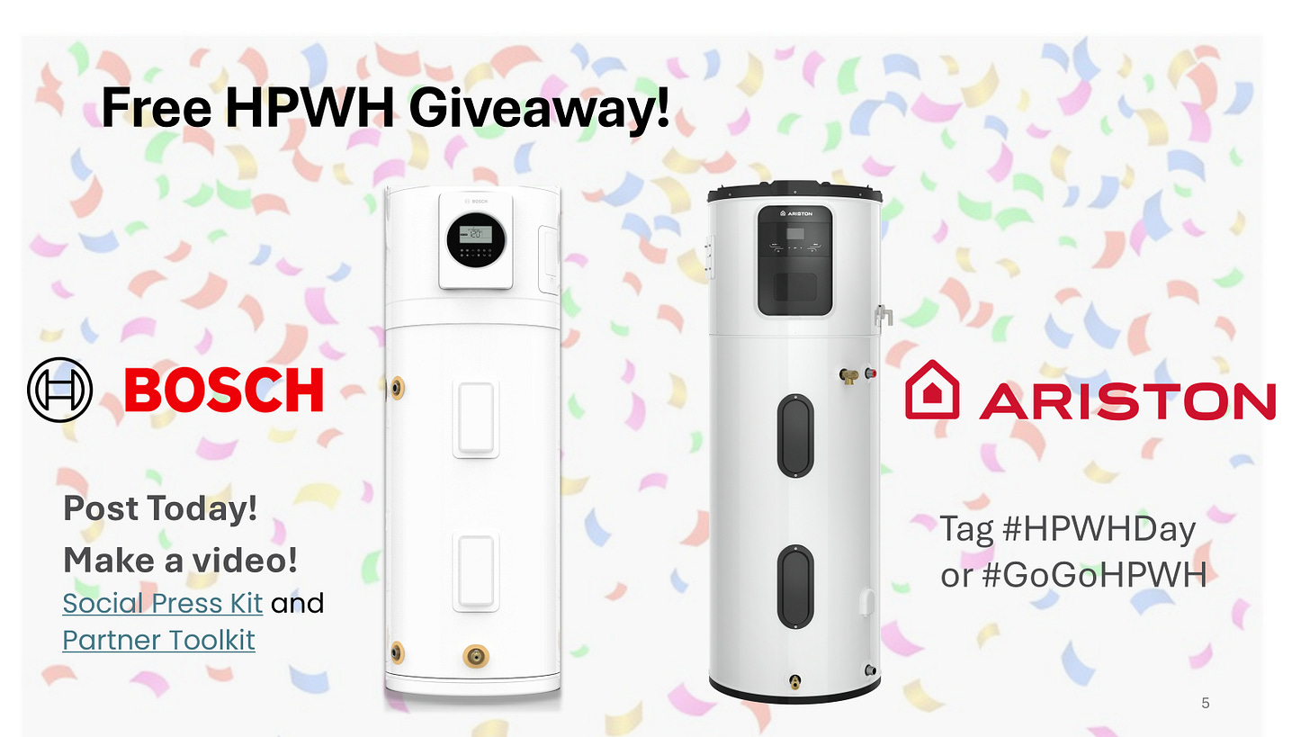 And to help raise awareness about heat pump water heating technology, two manufacturers (Ariston and Bosch) are donating a free HPWH and installation each to folks who post why they want one or why they love them. Yes, all you have to do to enter the raffle is post a message on any social media platform on or before October 23 to celebrate heat pump water heaters. Be sure to tag #HPWHDay.