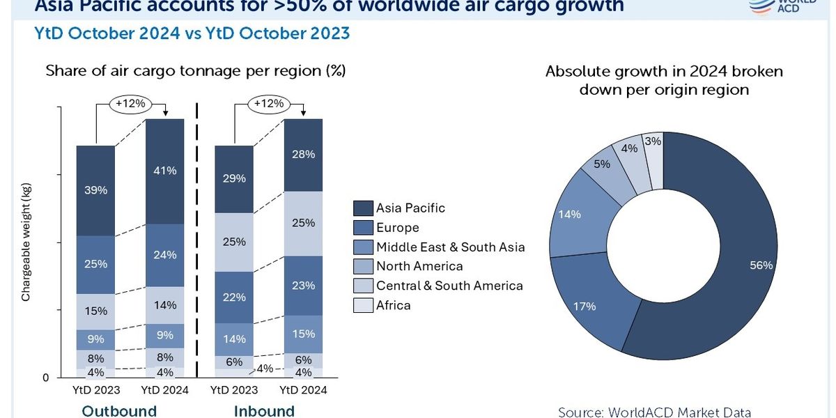 Asia Pacific origin markets are continuing to contribute an outsize share of worldwide air cargo growth this year, generating more than half (56%) of the global +12% year-on-year (YoY) increase in tonnages in the first 10 months of 2024, according to an analysis by WorldACD Market Data.