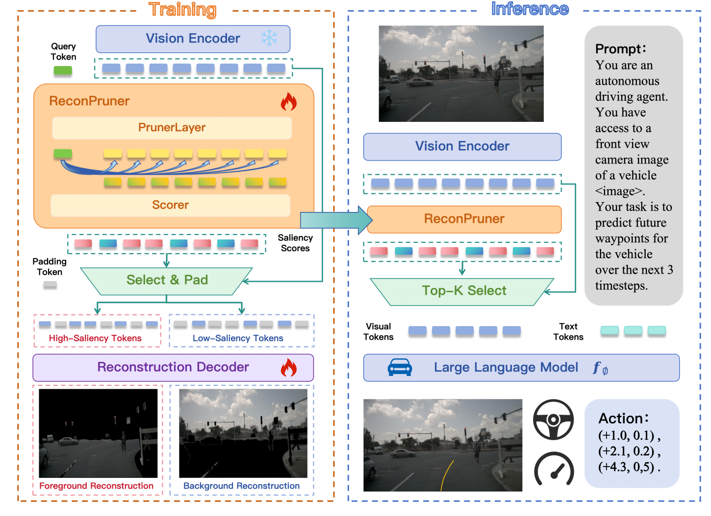 As AI large models evolve rapidly, VLA models are being widely adopted in end-to-end autonomous driving systems due to their strong capabilities in complex scene understanding and action reasoning. These models encode images into large numbers of visual tokens, which serve as the foundation for the model to “see” the world and make driving decisions. However, processing large numbers of tokens increases computational load onboard the vehicle, impacting inference speed and real-time performance.